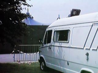 A double-deck-bus passing my camper taking home the camping people on